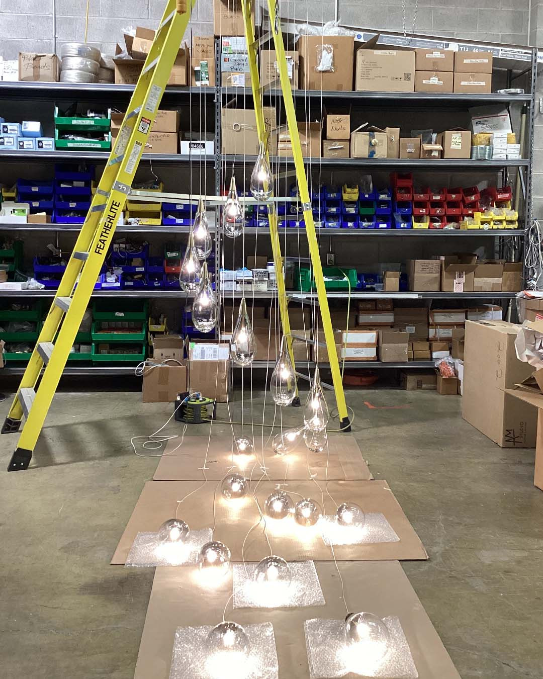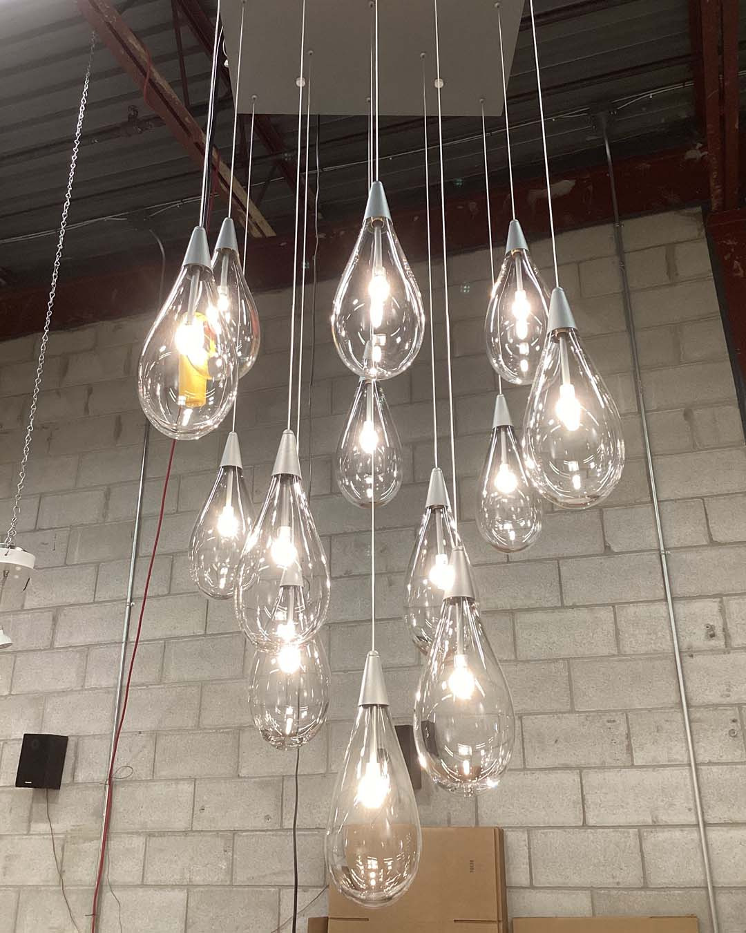 As though pulled from the ceiling by the strongest force of attraction, this cluster features clear and frosted glass pendants pinched by pressure. Staggered in a pointy, stalactite shape the overall impression is an elegant cascade of icy raindrops. Paired with barely-there support lines, the effect is awe-inspiring. A grand Gravity cluster is ideal for staircases, foyers, and living/dining spaces. A small cluster of Gravity would wow in the powder room or above the bedside table.