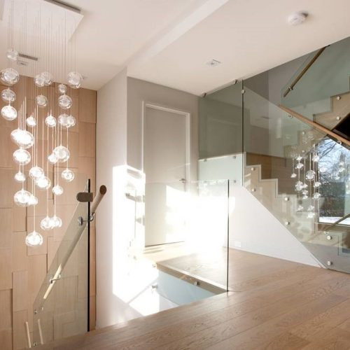 As shown in image: 13 Fiberglass Balls (Clear) Pendant Chandelier, suspending on a 18"DIA circular ceiling base, total drop of 60"H.