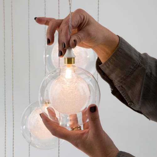 The Fiberglass Balls begin with thin fiberglass strands that are twirled around a hand-blown glass ball. A second clear hand-blown glass ball encapsulates the smaller bulb, adding a quiet balance to the fixture. Provides a great source of light that is dimmable for a softer ambiance. Great contemporary lighting for residential and commercial spaces.