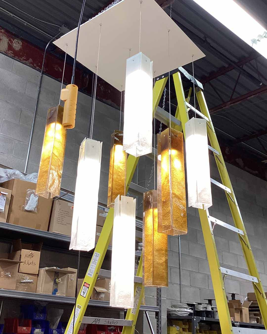 As shown in image: 13 Long Drops suspending on a 22"L x 22"W ceiling base, total drop of 84"H, custom sizes and configurations available.