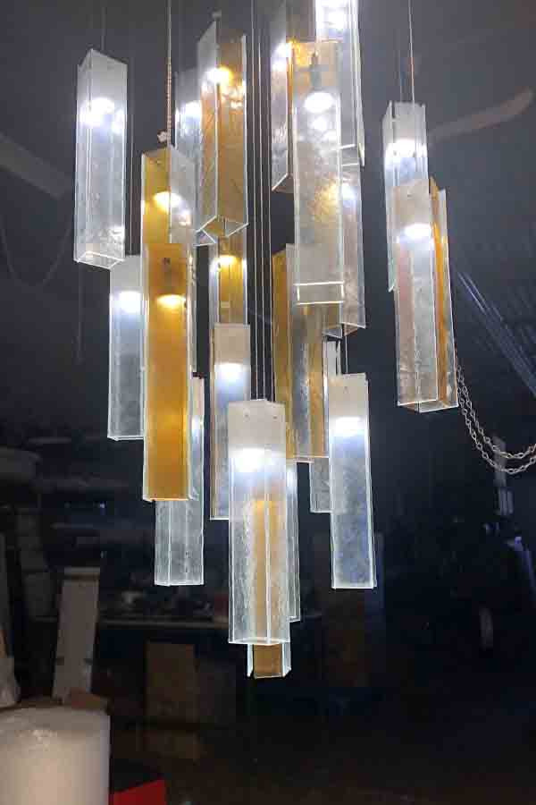A whimsical light fixture used in residential and commercial applications as an ambient and artistic fixture with spotlight bulbs. Hand-made glass leaves (3"L x 16"H) are suspended by thin wires that stem from a custom-made ceiling base.