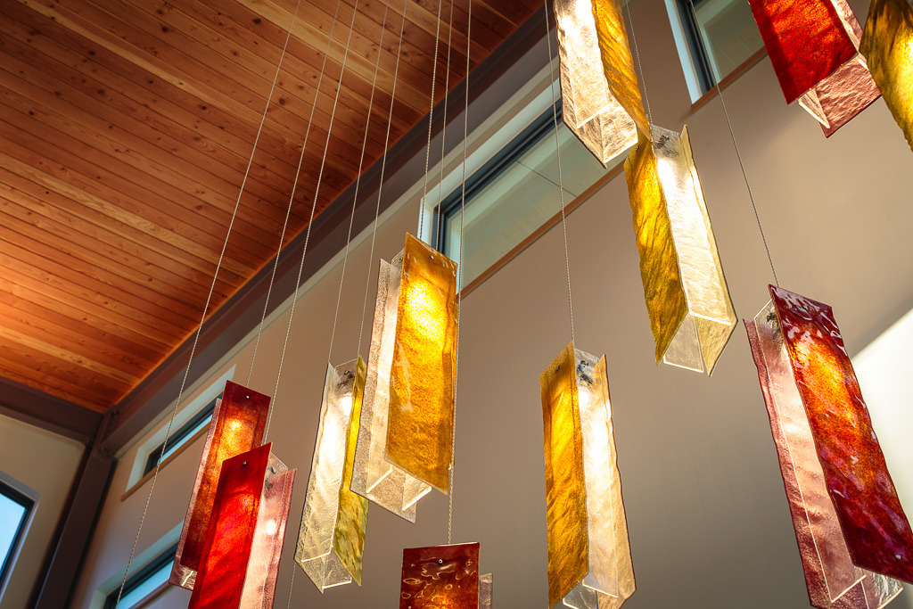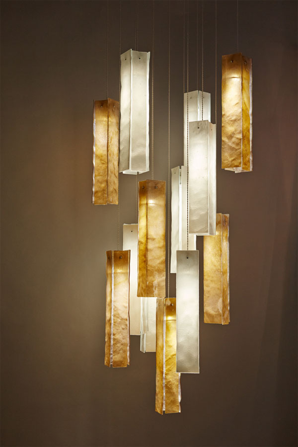 A whimsical light fixture used in residential and commercial applications as an ambient and artistic fixture with spotlight bulbs. Hand-made glass leaves (3"L x 16"H) are suspended by thin wires that stem from a custom-made ceiling base.