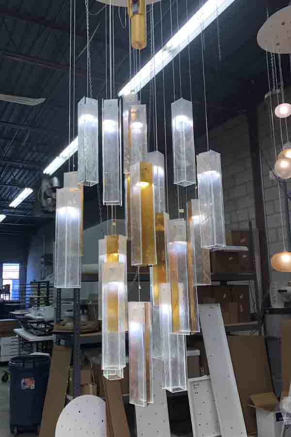As shown in image: 3 Long Drops suspending on a 36"L x 6"W ceiling base, total drop of 48"H, custom sizes and configurations available.