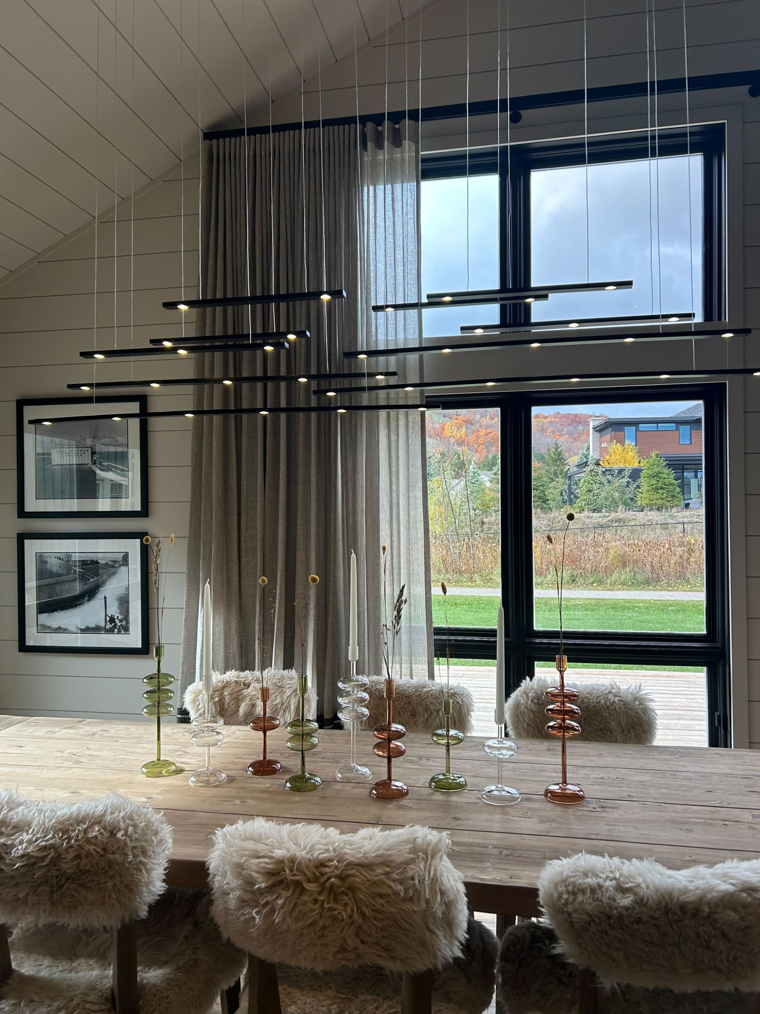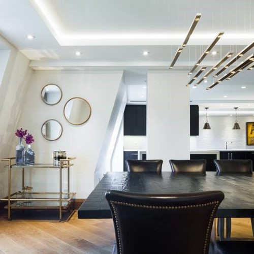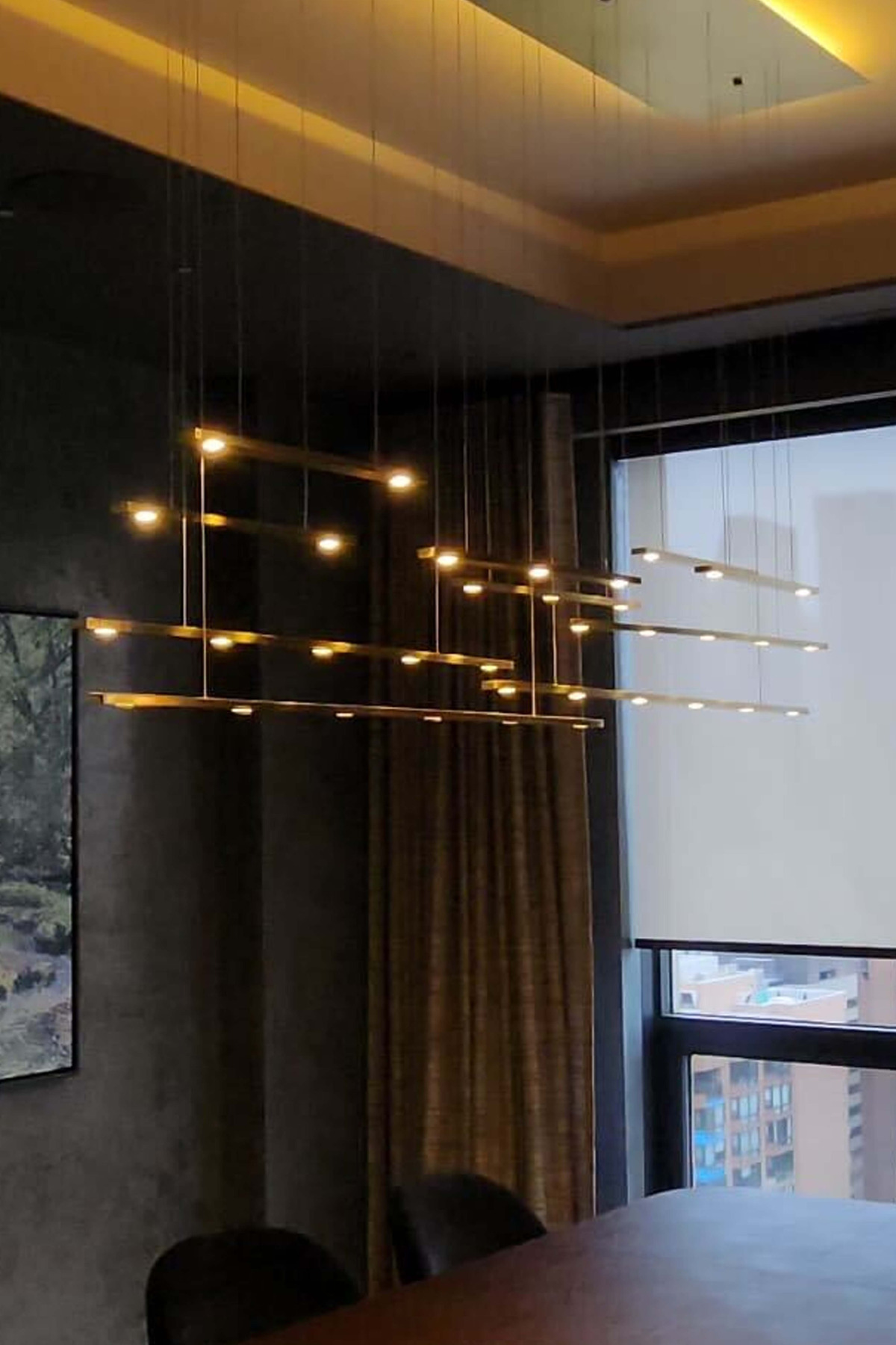 7 Flying Lines - AM Studio introduces an innovative, architectural approach to a light fixture– the Flying Lines. Sleek metal panels encasing LED bulbs fly down from a custom coated ceiling base on thin electrical wires. Custom configurations make the fixture perfect for both high and low ceilings, above a dining table, island, a reception desk or seating area. The fixtures’ length, height, number of panels and surface finish can all be customized.