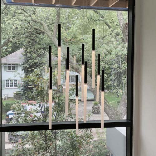 An elegant and sophisticated fixture that creates streaks of light, evocative of glowing raindrops. The many tubes are made of metal with frosted glass tubes of various lengths. The modern, sleek Glass Flashlights stagger down from a custom ceiling base to illuminate your space – custom for high/low ceiling.