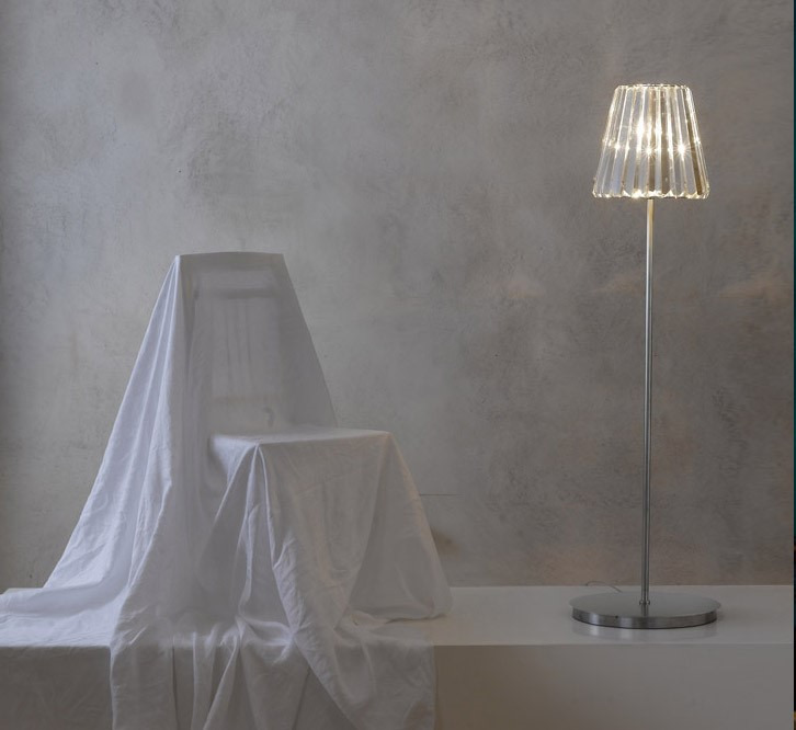 This clear “pleated” lamp-shades with right angle cranked legs stand in contrast with the ornamental composition of shadows that appear on the walls after you switch on the light. The classical design together with an optical projection merges into a “romantic functionalism”. The reflections of the light on the sharp-cut edges of glass and shadows, are creating an outstanding atmosphere and sophisticated mood of an interior. The shadow and light create an optical illusion. Light along with the translucent texture of the glass and striking expressiveness create a play between light and shadow.