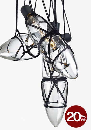 Knot, a collection of stately pendent lights, contrasts two dissimilar materials, two dissimilar notions: gentle curves in clear handblown glass against the austerity of coarse rope. The resulting design is striking, forthright, and dignified at the same time. Full-bodied globes of varying shapes and sizes are penetrated by robust rope ending in the core design element of the collection – the knot – which seemingly pulls the bottom of the glass inward for a bemusing plastic effect. The LED light source is mounted beneath an elegant hood made of stamped metal and protected from below by a handblown opal diffusor. Another metal component serves to cap the end of the rope. KNOTs are well-suited to both private and public interior spaces and make a particularly impressive statement above dining tables. The collection comprises four pendant lights and several colour options. Knot Small expands the Knot collection with smaller versions of each light. The new size comes in response to increasing demand for compact lights suited to smaller interiors with lower ceilings.