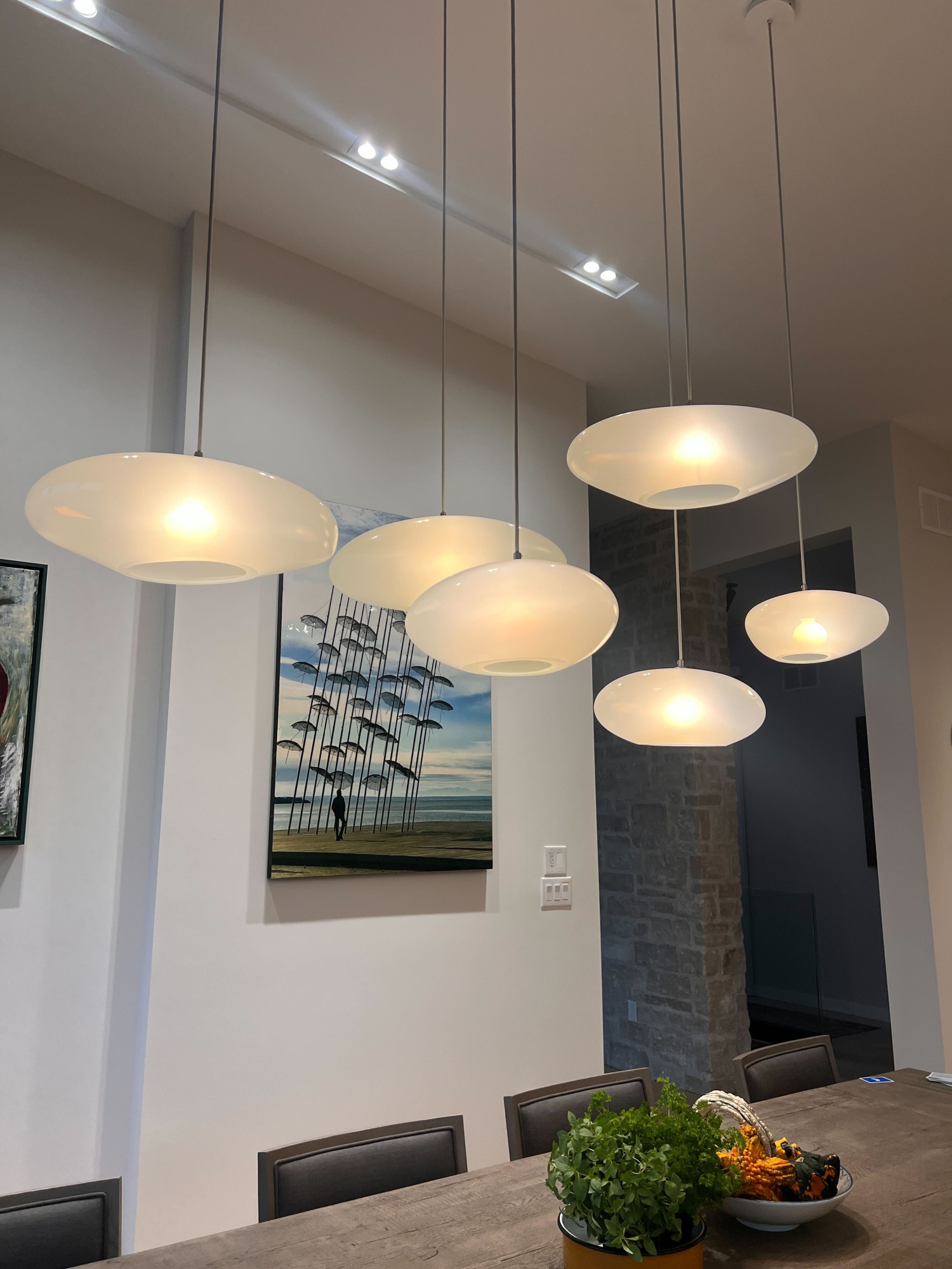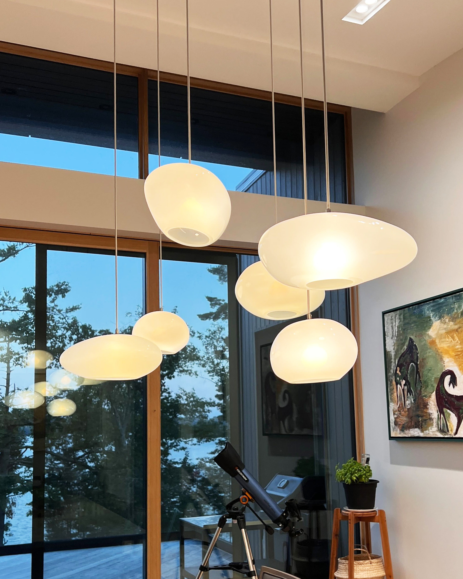 Available in three different sizes and two custom colours – opal stone and smoke – Sonne pendants are sold individually but are that much more impactful when clustered. Made from hand-blown glass, the asymmetrical shapes (each one unique) suggest planetary forms found in the solar system, perhaps a fiery meteorite. Their warm, ambiance-influencing glow make these pendants an enthralling addition to dining, cooking, and entertaining spaces.