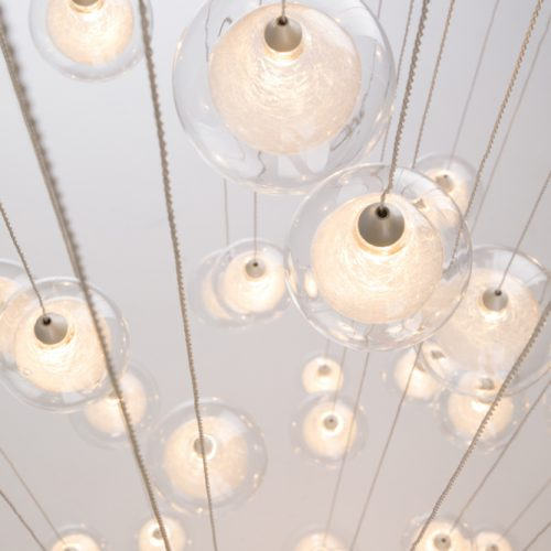 The Fiberglass Balls begin with thin fiberglass strands that are twirled around a hand-blown glass ball. A second clear hand-blown glass ball encapsulates the smaller bulb, adding a quiet balance to the fixture. Provides a great source of light that is dimmable for a softer ambiance. Great contemporary lighting for residential and commercial spaces.