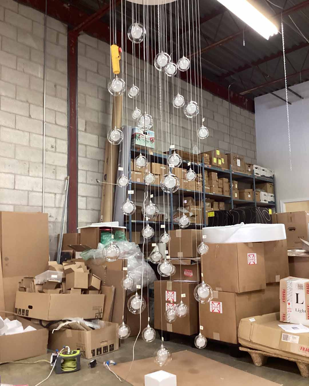 As shown in image: 19 Fiberglass Balls (Clear and Gold) Pendant Chandelier, suspending on a 20"DIA circular ceiling base, total drop of 84"H.
