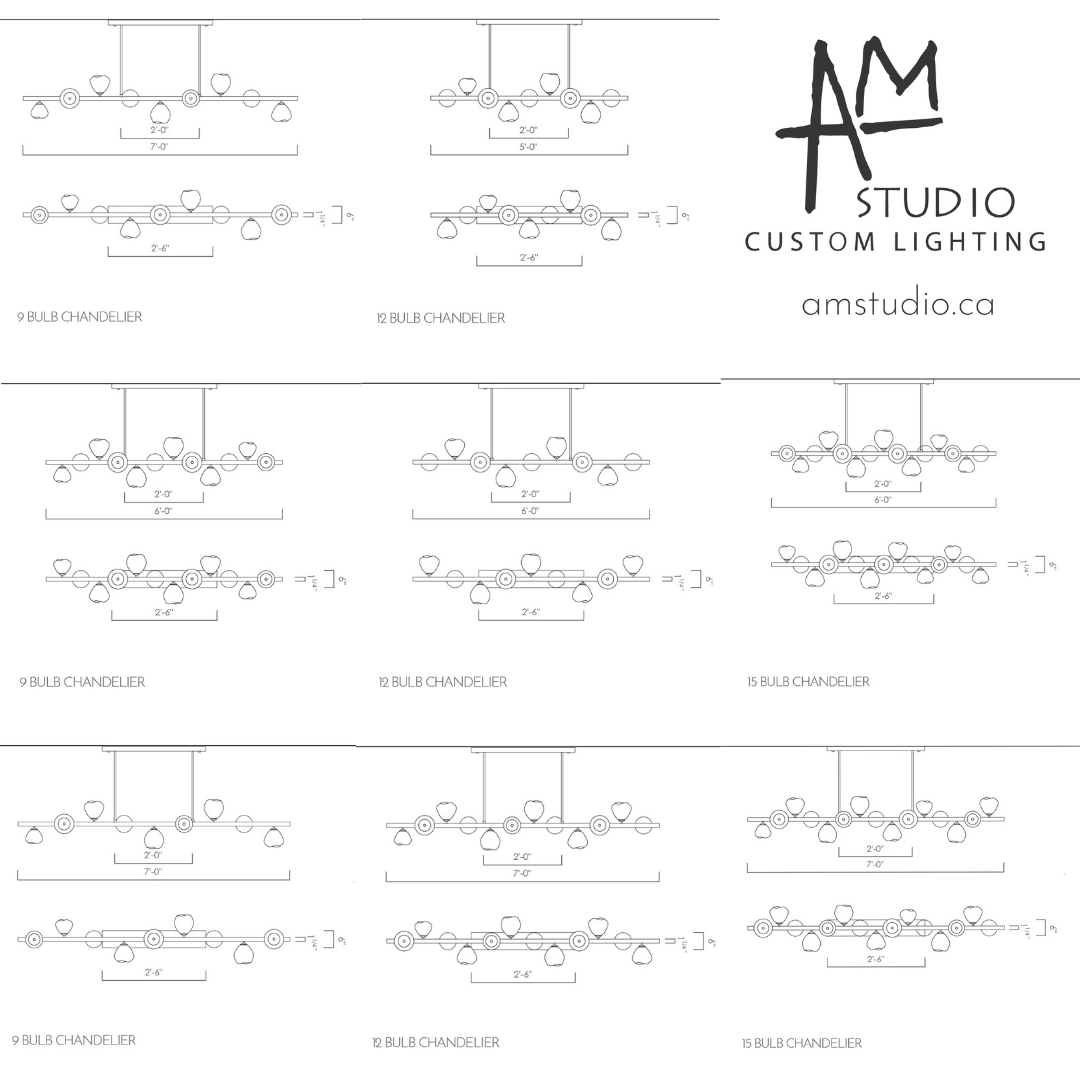 The Blooming Post Chandelier is a modifided version of the Blooming Post Lamp - a modern interpretation of the glass and metal floor lamps popular in the 1970’s. The chandelier suspends the post horizontally from the ceiling. This collection is a collaboration with Canadian glass artist Karli Sears, starts with a stretch rod that adjusts to the height of your ceiling. Along the rod sits 12 hand blown glass orbs that shine light in different angles. Glass colours are customizable. The Blooming Post Lamp can be wired from the ceiling if a junction box is present, or plugged in from the bottom into a nearby outlet and placed anywhere in your space. Perfect in a corner of a living room, as a bedside lamp, study, and in condos with concrete ceilings.
