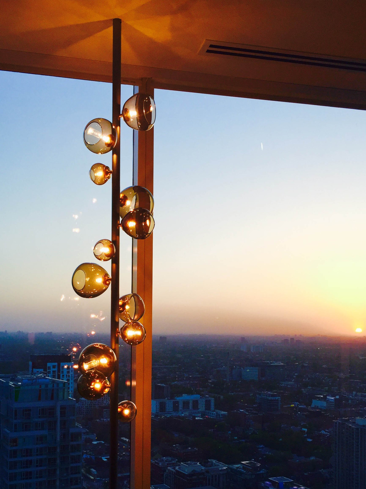 The Blooming Post Lamp is a modern take on the glass and metal floor lamps popular in the 1970’s. Our interpretation, designed in collaboration with Canadian glass artist Karli Sears, starts with a stretch rod that adjusts to the height of your ceiling. Along the rod sits 12 hand-blown glass orbs that shine light in different angles.