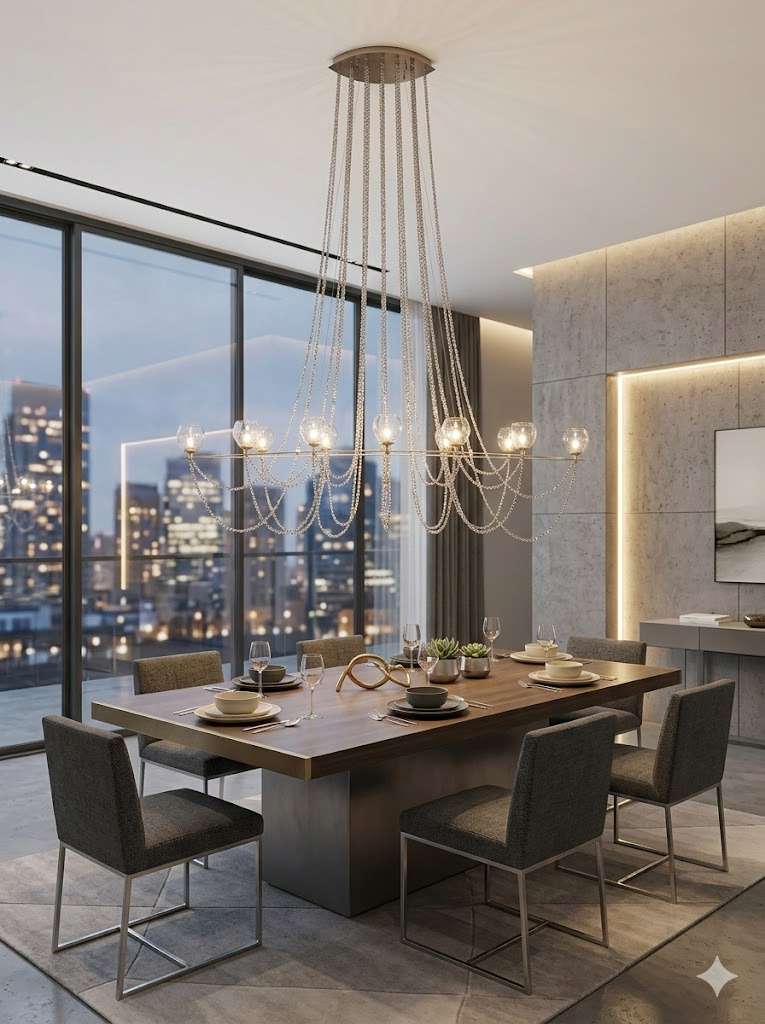 The finish of the Eye Chandelier is fully customizable and the height of the future can drop according to your space. Perfect for foyer, staircase and dining.