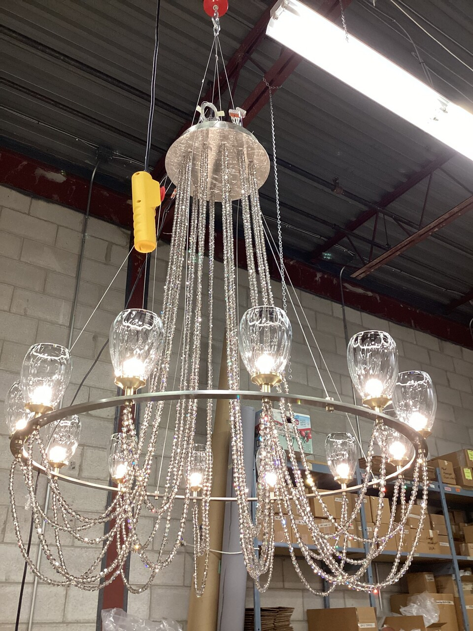 Comprised of 12 clear hand-blown glass pendants w/ LED bulbs connected by brass holders on the Eye-shaped rim that is suspended by aircraft wires from the ceiling base.