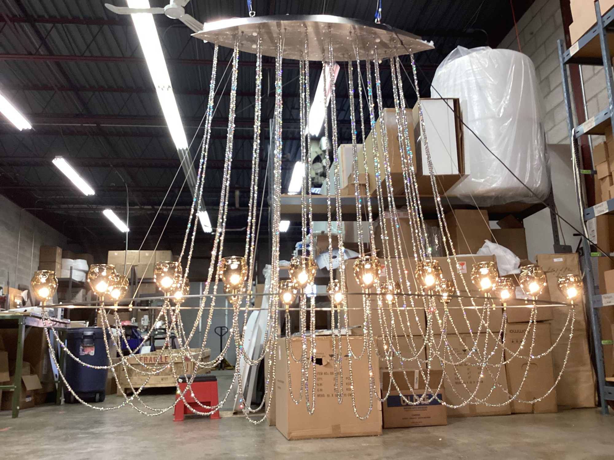 As shown in image above: 12 Pendants situated on a 60” x 16”W x 20"H Eye-shaped ring, suspending from a ceiling base (19”L x 10”W) with a total drop of 72”H. Custom size and shape available.