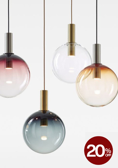 The Orbit Bubbles Chandelier is fully customizable based on number of pendants, size, colour, ceiling base size, finish, and total length. Pendants are available in 5 sizes