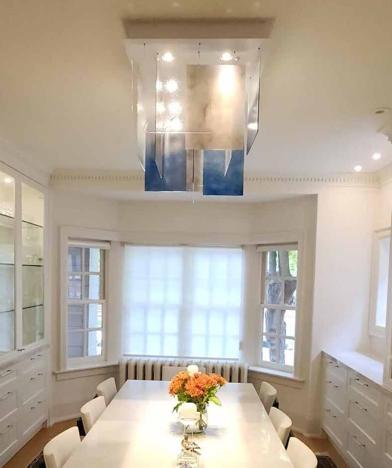 The avant-garde design of the Plisse light fixture exemplifies how aesthetic and function can work together harmoniously to provide an architectural piece of design. Hand-crafted glass panels are staggered in a perpendicular design that hang from a solid ceiling base which houses spotlights to illuminate the glass and the room with bright light.