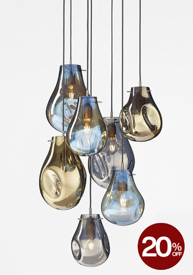 A symbol of unparalleled beauty, originality and craftsmanship, the Aqua fixture is a handmade blown glass pendant chandelier designed by AM Studio and glass artist Karli Sears. Each globe is hand-crafted with a frosted finish in white, medium aqua, navy blue and turquoise. Perfect as a dining chandelier along the table, a staircase chandelier staggering down from the ceiling, or pendants above the kitchen island.